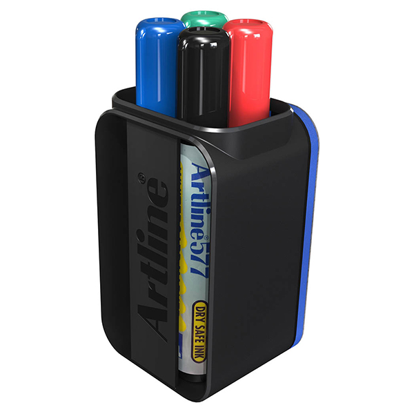 Ideal storage solution featuring a magnetic cup with eraser function for any whiteboard use. Features 4 x Artline 577 markers with dry safe function for up to 48 hours cap off time
