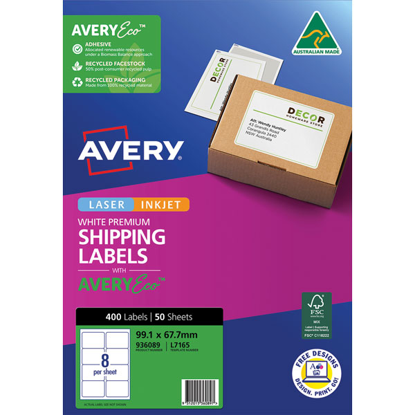 AVERY 936089 J8165 SHIPPING LABEL INKJET 8UP WHITE PACK 50 SHEETS