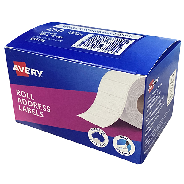 AVERY 937108 DMR102.36RA ROLL ADDRESS LABEL DISPENSER 102 X 36MM WHITE BOX 250