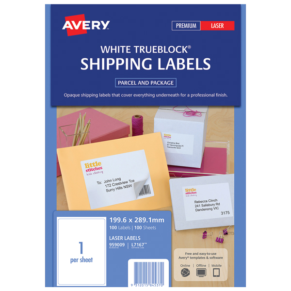 AVERY 959009 L7167 TRUEBLOCK SHIPPING LABEL LASER 1UP WHITE PACK 100