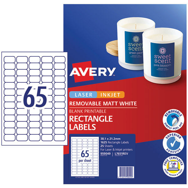 AVERY 959049 L7651REV REMOVABLE LABEL LASER INKJET 65UP WHITE PACK 25