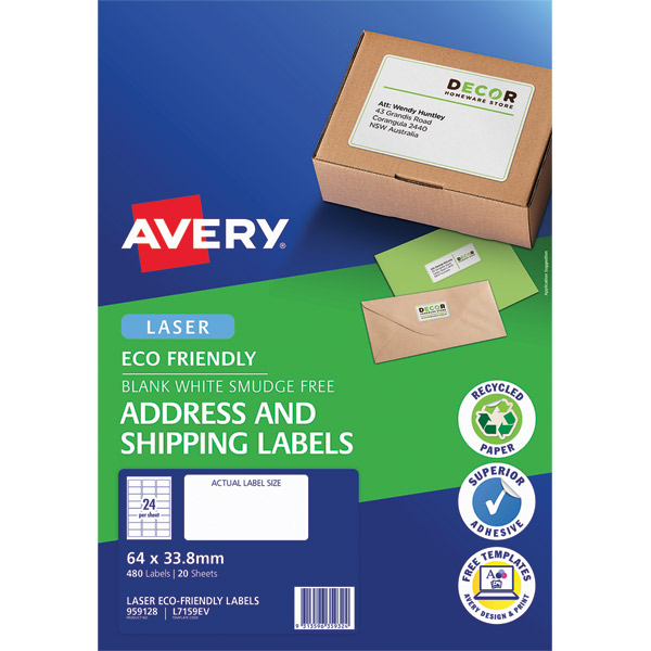 AVERY 959128 ECO FRIENDLY ADDRESS LABELS FSC W64 X L33.8MM 24UP PACK 20