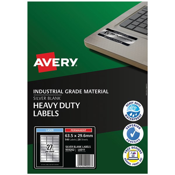 AVERY 959202 L6011 HEAVY DUTY LASER LABELS 27UP SILVER PACK 20