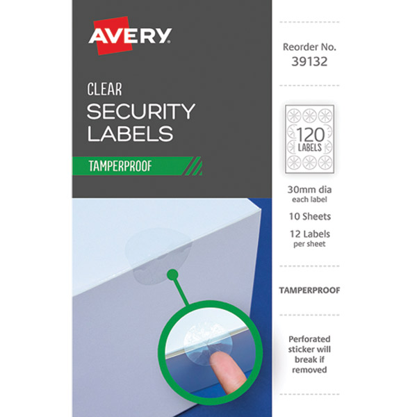 AVERY TAMPER PROOF LABEL 39132 CLEAR DOT 30MM 12UP 10 SHEETS
