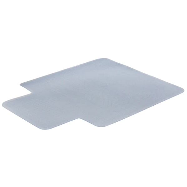A clear keyhole-shaped PVC chair mat that is flexible and will protect your carpet from high use wear