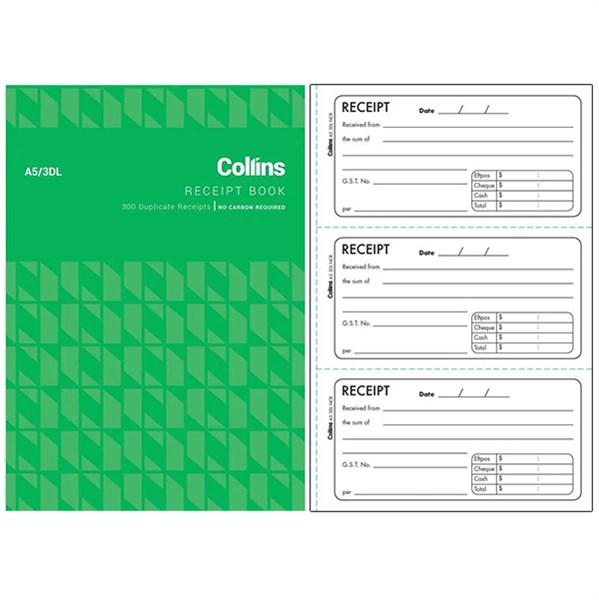 COLLINS RECEIPT BOOK 4 TO VIEW 4 DL DUPLICATE NO CARBON REQUIRED A5 50LEAF