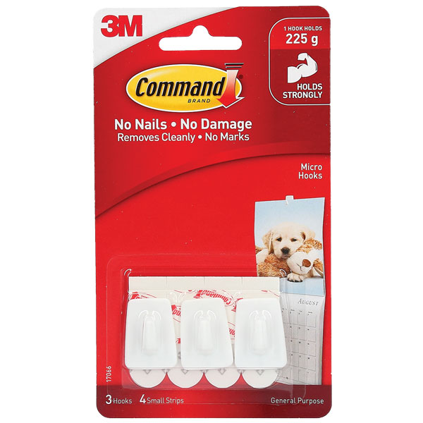 COMMAND ADHESIVE MICRO HOOKS WHITE PACK 3 HOOKS AND 4 STRIPS