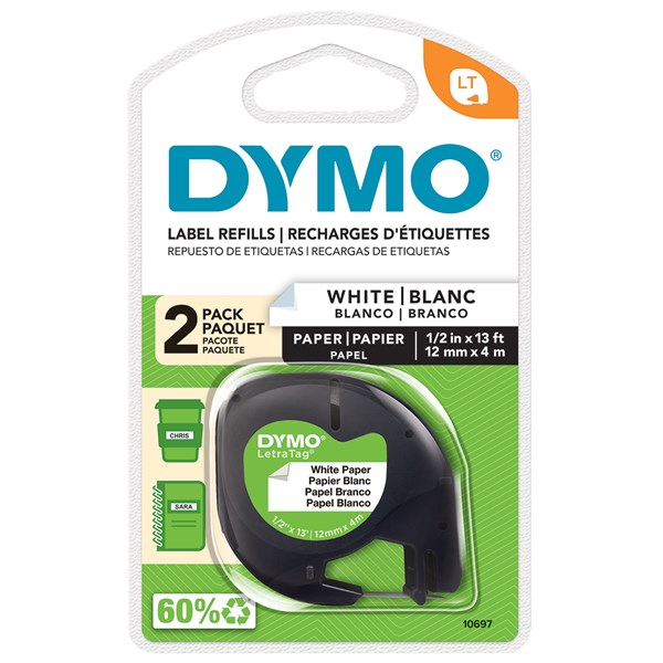 DYMO 92630 LETRATAG LABELLING TAPE PAPER 12MM X 4M BLACK ON PEARL WHITE PACK 2