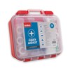Protect: 50 x adhesive dressing strips, 2 x large non-adherent dressing/pad, 3 x medium non-adherent dressing/pad, 6 x small non-adherent dressing/pad, 1 x sterile absorbent pad 5cm x 5cm, 1 x large sterile burn dressing, 1 x gauze roll bandage 4.5 x 10cm, 3 x conforming cotton bandages 5cm, 3 x conforming cotton bandages 7.5cm, 3 x adhesive tape rolls, 2 x disposable nitrile gloves (pairs), 2 x triangular bandages, 10 x safety pins