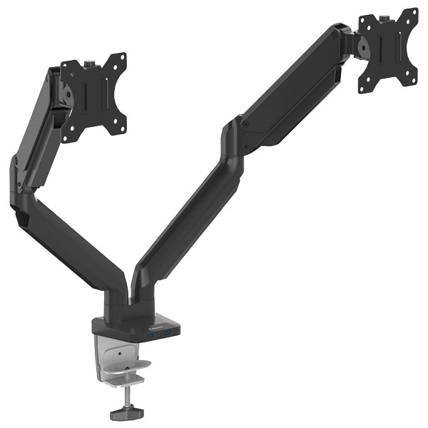 Easily mounted via clamp or grommet, each arm holds a monitor up to 9kg (up to 27 inch monitors) and meets VESA mounting standards