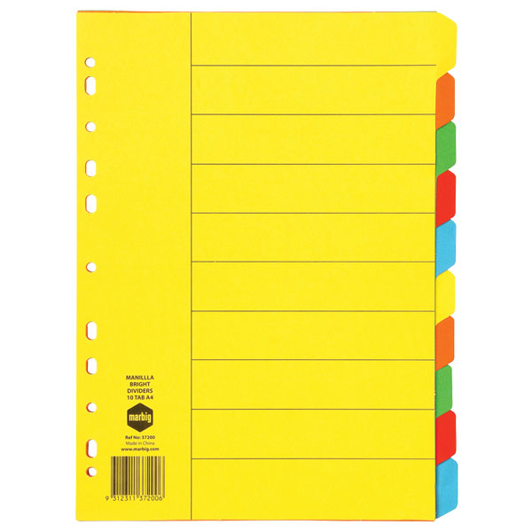 MARBIG MANILLA DIVIDER 10 TAB A4 BRIGHT ASSORTED