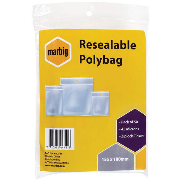 MARBIG PLASTIC BAG RESEALABLE 45MU W155 X L230MM CLEAR PACK 50