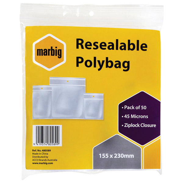 MARBIG PLASTIC BAG RESEALABLE 45MU W155 X L230MM CLEAR PACK 50