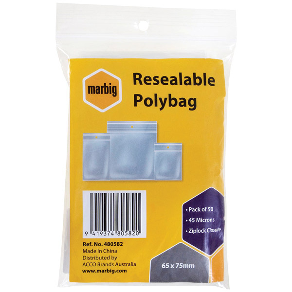MARBIG PLASTIC BAG RESEALABLE 45MU W65 X L75MM CLEAR PACK 50