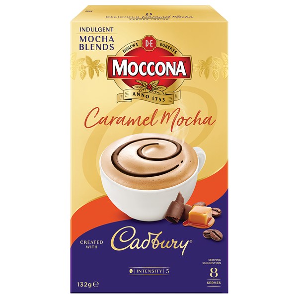 The perfect blend of Moccona coffee combined with Cadbury cocoa and a hint of Caramel flavour,? that delivers a creamy indulgent mocha experience, finished with a layer of velvety froth.