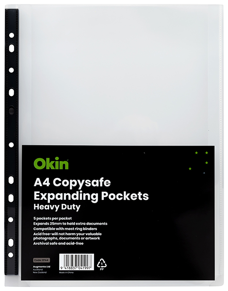 OKIN COPYSAFE POCKET HEAVY DUTY EXPANDING UP TO 25MM POLYPROPYLENE A4 CLEAR PACK 5