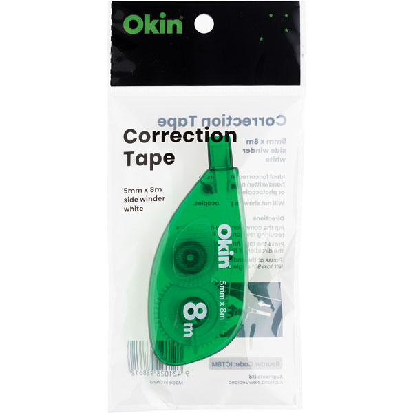 Okin Correction Tape fixes errors like they never happened. Using the easy-to-use dispenser the tape is smooth and requires no drying time so you can write on it instantly. Side dispensing mechanism allows you to clearly see what you are covering. 5mmx8m. White.