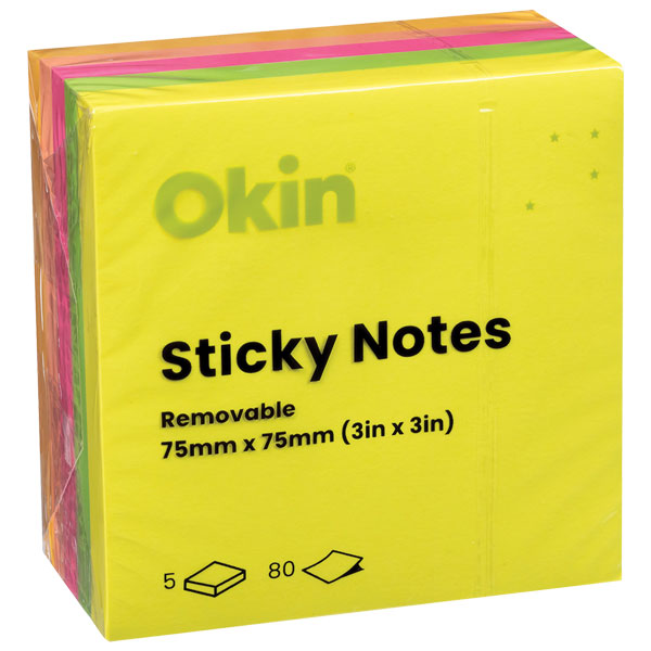 Okin Sticky Notes can be adhered to almost any horizontal surface. Ideal for paper to paper applications. 75mm x 75mm (3 x 3 inches). 80 sheets per pad. 5 pads per pack. Assorted Neon colours.