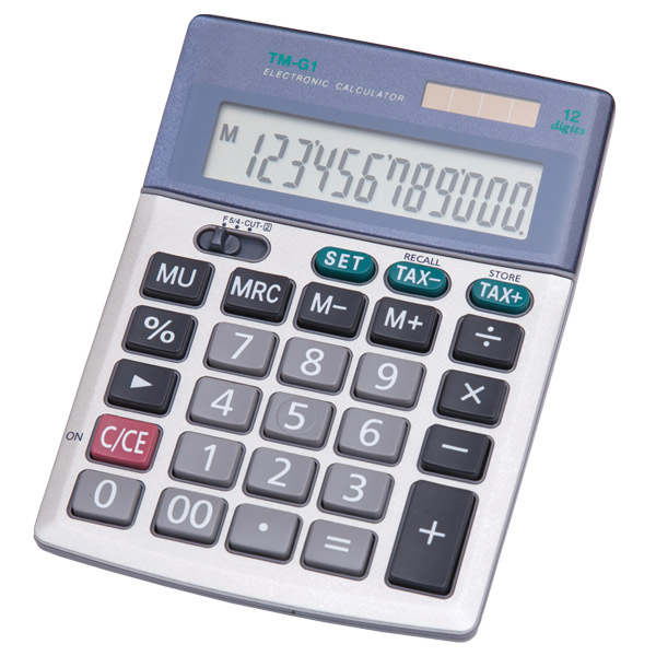 Desktop calculator with tilted 12 digit display
