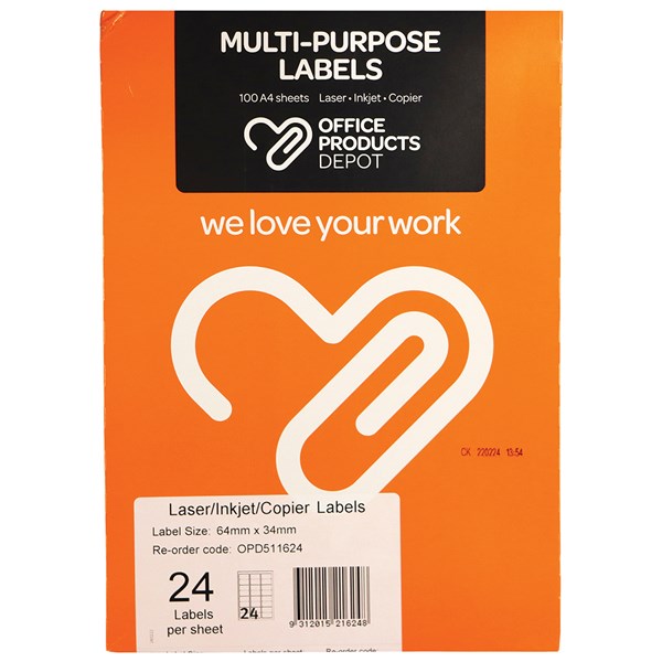 OPD PREMIUM MULTIPURPOSE LABELS 24UP 64 X 33.8MM PACK 100