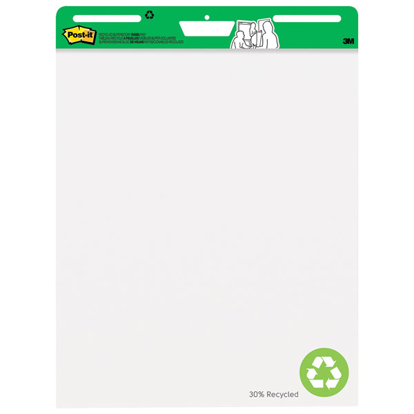 Made with recycled materials, Post-it Easel Pad sheets feature premium, bright white paper that resists marker bleed-through; they stick to most surfaces and can be repositioned again and again, without surface damage