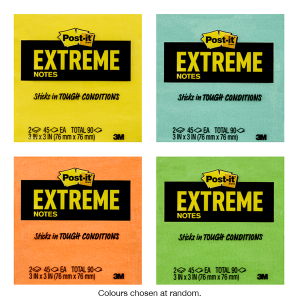 When conditions make communication tough, Post-it Extreme Notes make leaving notes and reminders simple, so you can get the work done. Made with Dura-Hold Paper and Adhesive, these notes will hold up in hot, cold and wet conditions. They stick to tough and textured surfaces like concrete, raw and painted wood, and tile. Make sure your message is seen with a note that sticks in tough conditions. This pack includes 2 pads of Post-it Extreme Notes, each pad has 45 sheets