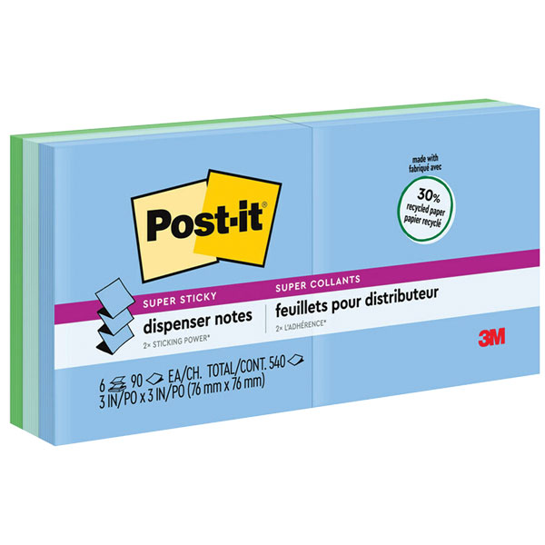 Post-it Recycled Super Sticky Pop-up Notes in 76mm x 76mm size make one-handed dispensing easy and help with multi-tasking.