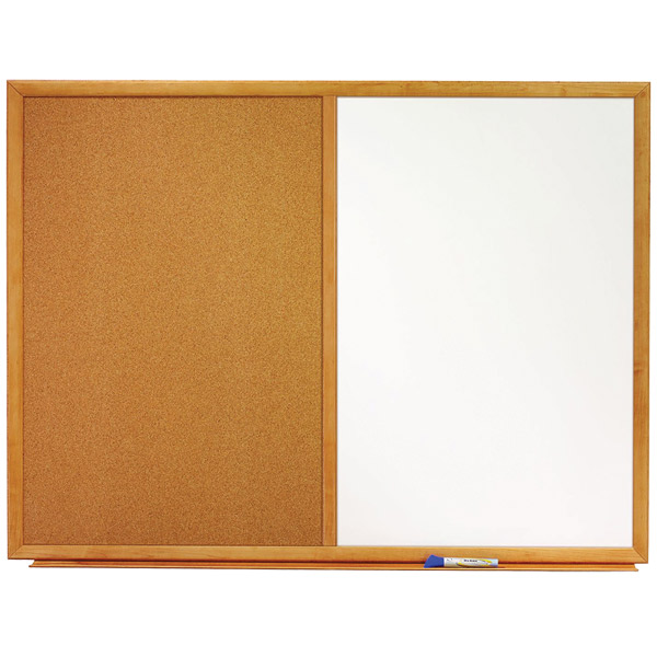 Quartet oak frame combination boards combine a melamine dry-erase surface with a natural cork surface to create the perfect note keeping duo