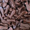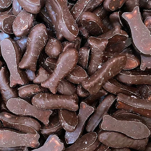 Small raspberry flavoured marshmallow fish coated in milk chocolate
