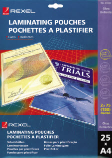 REXEL LAMINATING POUCH 75 MICRON A4 CLEAR PACK 25