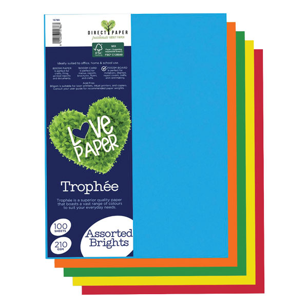TROPHEE COLOURED PAPER A4 210GSM ASSORTED BRIGHTS PACK 100