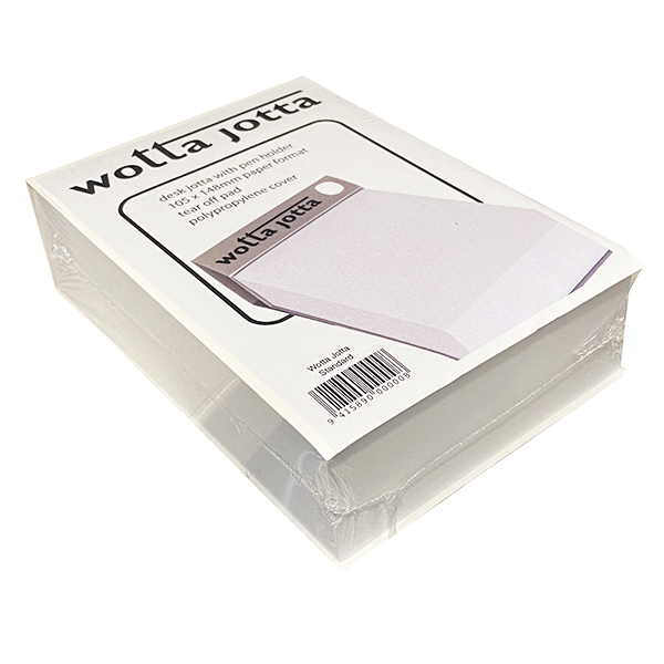 Plain but very useful the standard wotta jotta has 250 leaves of high quality white paper105 x 148mm paper format (4 inces x 6 inches)Desk jotta with pen holderDurable polypropylene cover